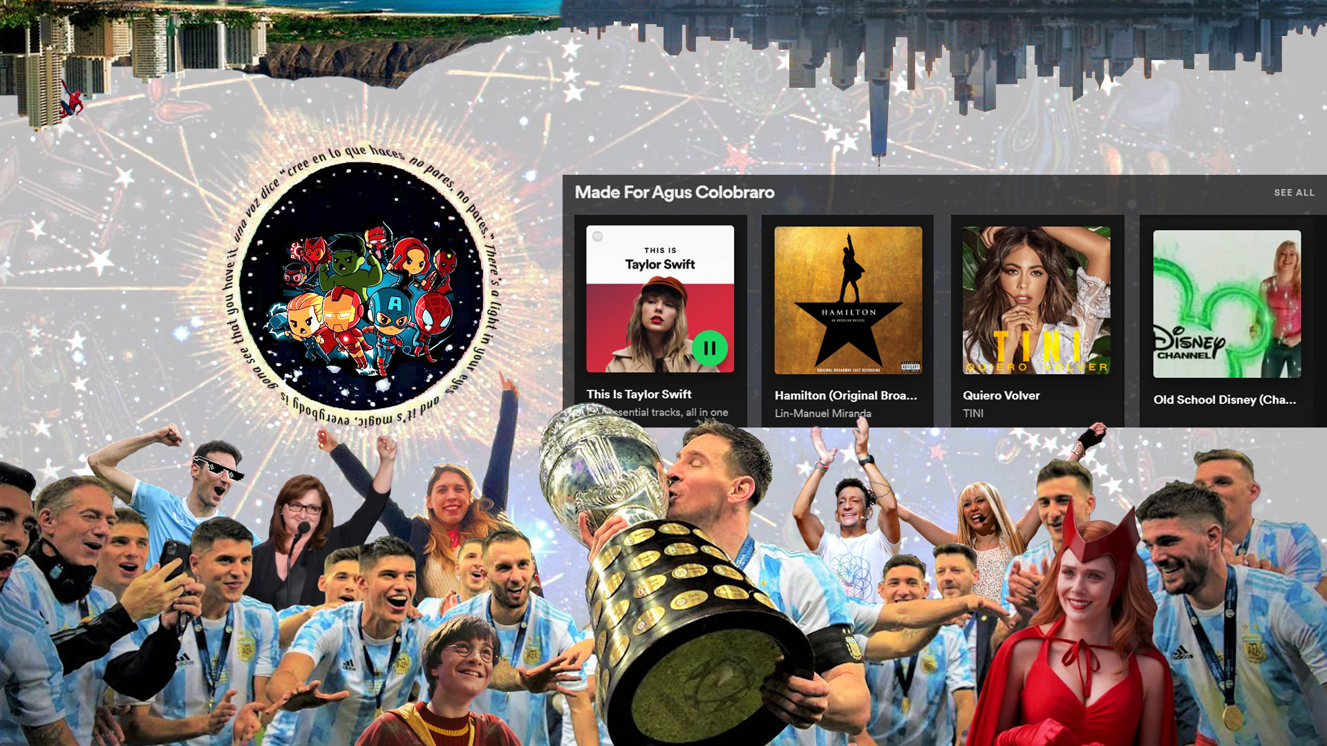 2 (music): I thought that this was a cool way to show the music that I like the most, as it is a literal screenshot of my Spotify homepage. Taylor Swift appears first because it is what I am listening to the most these past weeks, but the truth is that I keep rotating in between everything that is in the collage. The Hamilton soundtrack is there because it is my favorite play: I think the songs are incredible and meaningful, and they are always part of my life’s soundtrack. Quiero Volver by Tini is my favorite album of her. She is a singer from Argentina, but she is well kown around the world, as she was the main character in a Disney show called Violetta. Last but not least you can see a playlist called Old School Disney because the soundtrack from the old Disney series and movies are also some of my favorite things. In there you can find Hannah Montana, High School Musical, Lizzie McGuire, etc.